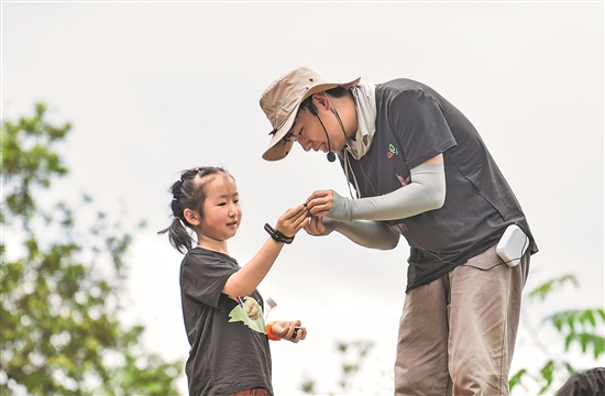 在黔東南苗嶺國(guó)家地質(zhì)公園,劉星宇(右)與暑期前來研學(xué)的孩子觀察一塊化石標(biāo)本(7月15日攝)。