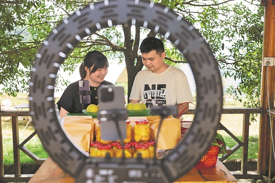 7月17日,在諸暨市同山鎮(zhèn)云上居農(nóng)莊內(nèi),黨員志愿者進(jìn)行助農(nóng)直播,助力黃桃及多種特色農(nóng)產(chǎn)品銷售。