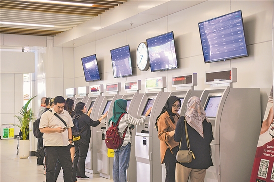 當(dāng)?shù)貢r(shí)間7月17日,乘客在印度尼西亞雅加達(dá)哈利姆站的自助取票機(jī)前取票。新華社記者 徐欽 攝