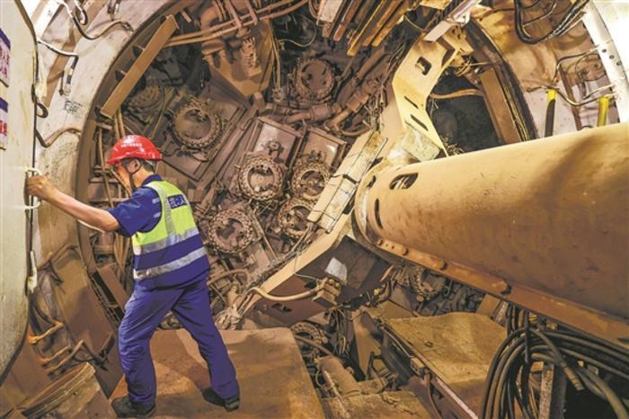 7月15日,施工人員打開廣州海珠灣隧道西線“大道先鋒號”超大直徑盾構機的刀盤艙門。
