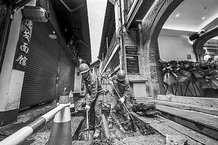 施工過(guò)程中,工作人員需先將350塊平均重量達(dá)400斤的青石板掀開(kāi),在埋設(shè)電力電纜后,再恢復(fù)原樣,原本簡(jiǎn)單的基礎(chǔ)開(kāi)挖工作不論難度還是工作量都呈幾何倍數(shù)地增長(zhǎng)。