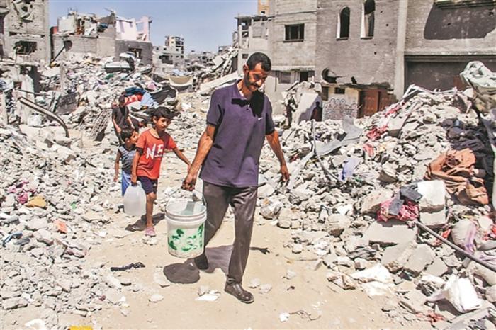 戰(zhàn)火導致加沙地帶滿目瘡痍,基礎設施遭到嚴重破壞。同時,人道主義援助機構進入加沙地帶日益艱難,援助物資運入受阻。加沙地帶多地生活物資缺乏,當地居民用水緊張。圖為近日,在加沙地帶北部,當地居民運水。