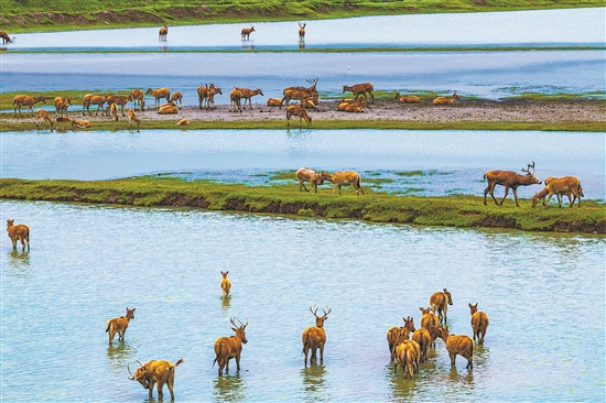 7月14日,江蘇省鹽城市大豐區(qū)野鹿蕩濕地,一群野生麋鹿正在淺水中覓食、嬉戲。
