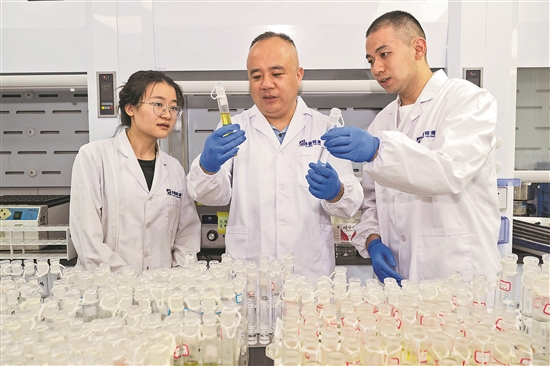 7月15日,在安徽省合肥廬陽(yáng)經(jīng)濟(jì)開(kāi)發(fā)區(qū)海峰分析測(cè)試科技有限公司勞模創(chuàng)新工作室,安徽工匠、合肥市勞動(dòng)模范張勇(中)正在指導(dǎo)青年技術(shù)職工對(duì)水環(huán)境樣本進(jìn)行檢測(cè)。