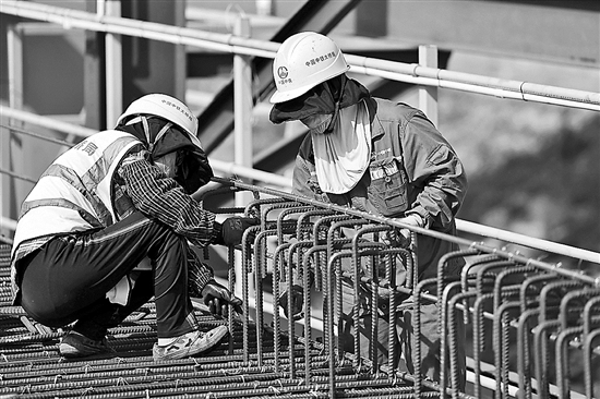 圖①:施工人員在中鐵大橋局杭州灣梁場綁扎鋼筋。新華社記者 黃宗治 攝