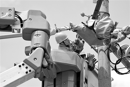 圖②:國網(wǎng)銀川供電公司帶電作業(yè)中心員工在進行帶電作業(yè)。新華社記者 王鵬 攝