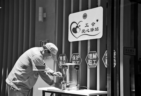 圖④:保潔員在西安浐灞國際港一處工會驛站領(lǐng)取綠豆湯。新華社記者 張博文 攝