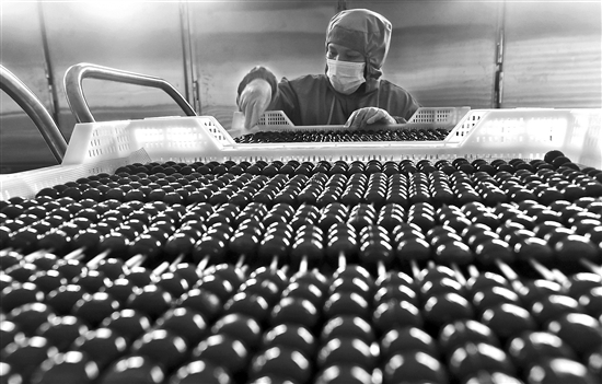 7月17日,山東淄博,在沂源縣悅莊工業(yè)園一果脯加工企業(yè),工人在包裝加工的果脯。近年來,山東省淄博市沂源縣依托當(dāng)?shù)刎S富的果品、蔬菜等農(nóng)產(chǎn)品資源,大力發(fā)展農(nóng)產(chǎn)品深加工產(chǎn)業(yè),建立起以果脯、薯片、果汁等多個食品加工產(chǎn)業(yè)集群,拉長了農(nóng)業(yè)產(chǎn)業(yè)鏈,帶動當(dāng)?shù)乇姸啻迕駥崿F(xiàn)家門口就業(yè)增收。