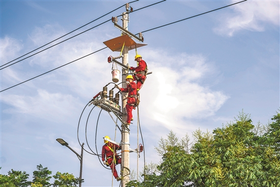 7月23日,在浙江省湖州市長興縣林城鎮(zhèn)大云寺村,為保障夏季高溫下居民可靠供電,國網(wǎng)長興縣供電公司施工人員實(shí)施電網(wǎng)設(shè)施補(bǔ)強(qiáng)工程,架設(shè)新線路,增強(qiáng)電網(wǎng)供電能力。