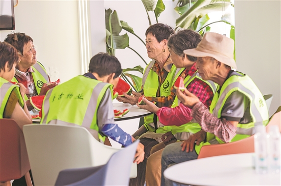 7月24日,戶外勞動者在湖山府社區(qū)工會驛站休息、品嘗解暑水果。