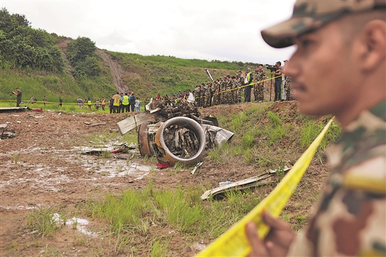 這是7月24日在尼泊爾首都加德滿都特里布萬機(jī)場拍攝的事故現(xiàn)場。