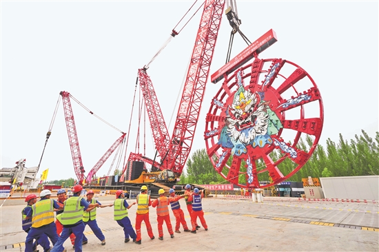 7月24日,“山河號”盾構機刀盤被履帶式起重機從地面吊運至濟南市黃崗路穿黃隧道盾構始發(fā)井。