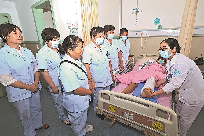 7月25日,在浙江省紹興市中心醫(yī)院骨科病房,護(hù)士長正在考核指導(dǎo)首批“無陪護(hù)”病房護(hù)工。為減輕患者家屬陪護(hù)時間和經(jīng)濟(jì)壓力,該院正式啟動骨科和神經(jīng)外科“無陪護(hù)”試點(diǎn)病房運(yùn)營,家屬自愿選擇是否陪護(hù),陪護(hù)公司統(tǒng)一調(diào)配專業(yè)護(hù)工,家屬可探視。本報通訊員 單明銘 攝