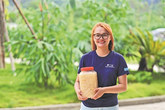 當(dāng)時(shí)柳州螺螄粉產(chǎn)業(yè)正迎來快速發(fā)展期,螺螄粉原材料市場(chǎng)潛力巨大。顏茜茜和父親顏建條成立了農(nóng)業(yè)公司,采用“公司+種植基地+合作社+農(nóng)戶+加工廠”的經(jīng)營(yíng)模式,發(fā)展竹筍種植、研發(fā)、腌制產(chǎn)業(yè),探索傳統(tǒng)腌菜產(chǎn)業(yè)規(guī)?;⒏咂焚|(zhì)生產(chǎn)新模式。顏茜茜也從“青春靚麗的航空地勤小姐姐”,轉(zhuǎn)變?yōu)椤皵]起袖子在田間地頭和鄉(xiāng)村工廠間勤勞奔走的‘筍丫頭’”。