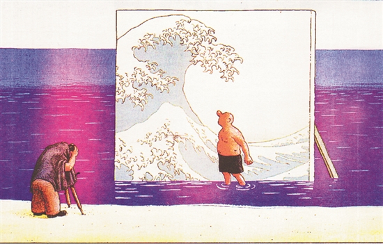 海邊豎起波浪濤天的景版,“勇敢者”佇立期間,擺出“勝似閑庭信步”的架勢……經(jīng)過特寫和加工創(chuàng)作出“駕馭潮流”的好漢大作。