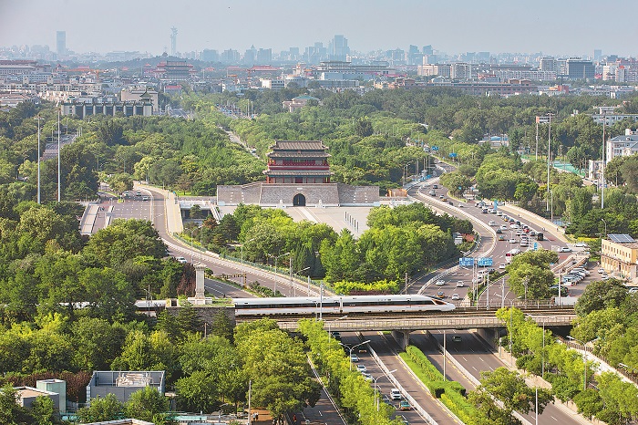 圖為7月27日,復(fù)興號動(dòng)車組列車經(jīng)過位于北京中軸線上的永定門前。