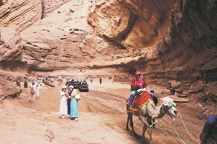 圖為近期游客在新疆維吾爾自治區(qū)庫(kù)車(chē)市天山神秘大峽谷觀光游覽。