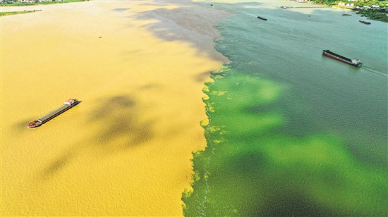 7月25日,江西省九江市湖口縣,長(zhǎng)江和鄱陽(yáng)湖交匯。長(zhǎng)江水系渾濁,鄱陽(yáng)湖水系清澈,在江湖匯合處形成涇渭分明的“江湖兩色”奇特景觀。傅建斌 攝/視覺中國(guó)