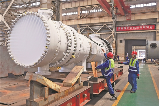 7月25日,在蘭州新區(qū)蘭石集團高端裝備產業(yè)園,工人在吊裝儲罐設備。