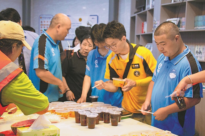 日前,在浙江省臺州市椒江萬達廣場“365+勞動者驛站”,一場特別的納涼音樂會后,驛站為戶外勞動者準備了西瓜、銀耳湯、酸梅湯等防暑降溫物品,讓他們在忙碌的工作之余,消夏納涼,緩解疲憊,放松身心。本報記者 鄒倜然 本報通訊員 何依妮 攝