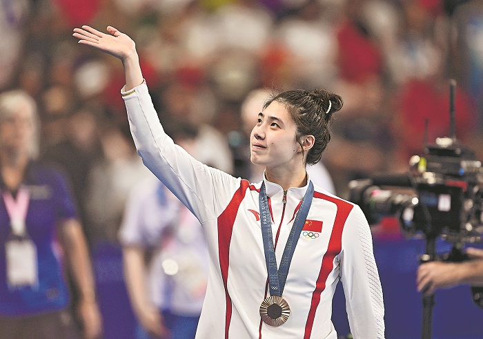 7月28日,張雨霏獲得季軍后向觀眾致意。新華社記者 王鵬 攝