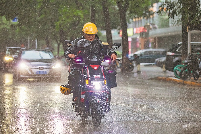 當(dāng)日,受副熱帶高壓外圍偏南氣流和高空槽的共同影響,北京市處于暴雨藍(lán)色預(yù)警中。為了保障城市的有序運(yùn)行和滿足市民的生活需求,外賣騎手、快遞小哥、環(huán)衛(wèi)工人等戶外工作者穿行在風(fēng)雨中,給市民帶來便利。