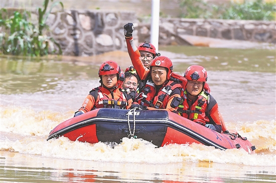 7月29日,在吉林省臨江市,臨江市消防救援大隊世紀大街站副站長白云天(右二)在轉(zhuǎn)運受困群眾時,用手勢指揮隊員操控船只。