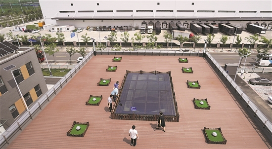 樓頂“綠電工廠”安裝的可透光碲化鎘發(fā)電玻璃(7月31日攝)。