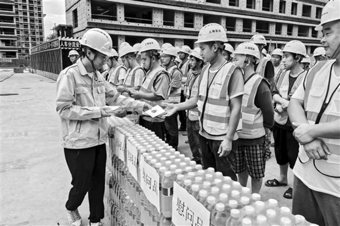 7月29日,在北京大興新城核心區(qū)德賢華府項目,承建方在工地現(xiàn)場一邊開展農(nóng)民工工資普法宣傳活動,一邊進行“戰(zhàn)高溫,送清涼,保安全”高溫慰問,為工友們送去清涼與關(guān)懷。本報通訊員 裴麗萌 攝