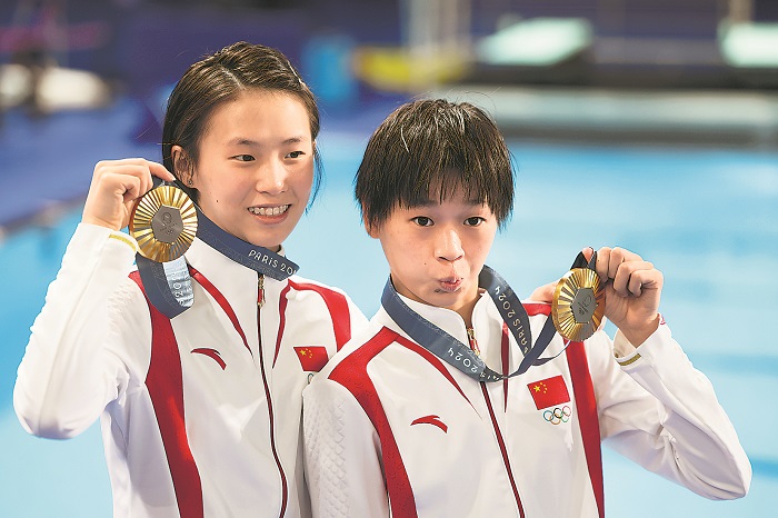 圖為陳芋汐(左)和全紅嬋展示金牌。本報(bào)特派記者 楊登峰 攝