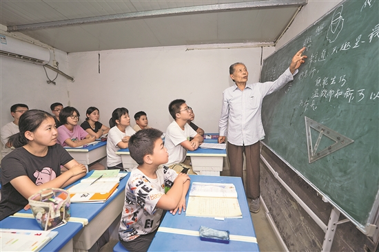 早晨七點,大倫鎮(zhèn)申揚村退休教師馬如松的家里熱鬧起來,馬老師手握三角尺、粉筆,在黑板上邊畫圖邊講解幾何題,講臺下十余名學(xué)生做著筆記。