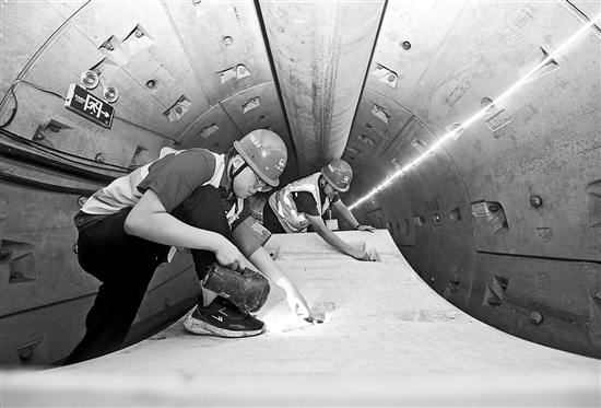 7月30日,工作人員在雨水主管隧道內(nèi)檢查盾構(gòu)管片。
