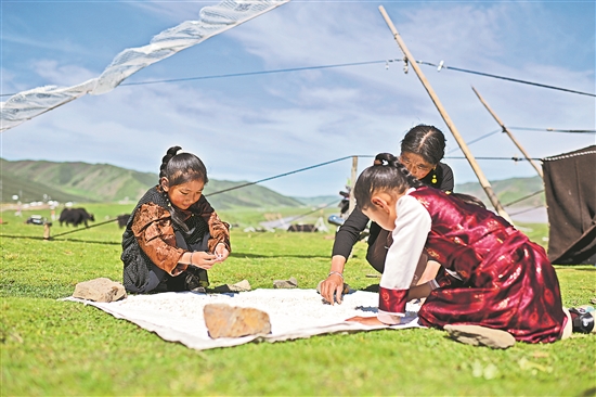 8月1日,尕瑪拉毛(左)在幫媽媽曬曲拉(一種奶制品)。