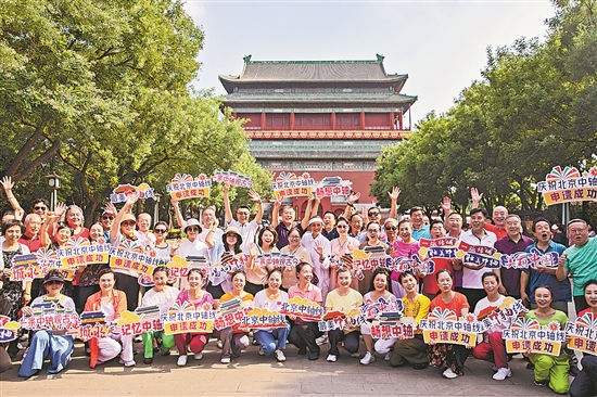 7月27日下午,眾多市民來到北京中軸線上的鐘鼓樓廣場參加北京中軸線申遺成功快閃慶?;顒印1緢笥浾? 王偉偉 攝