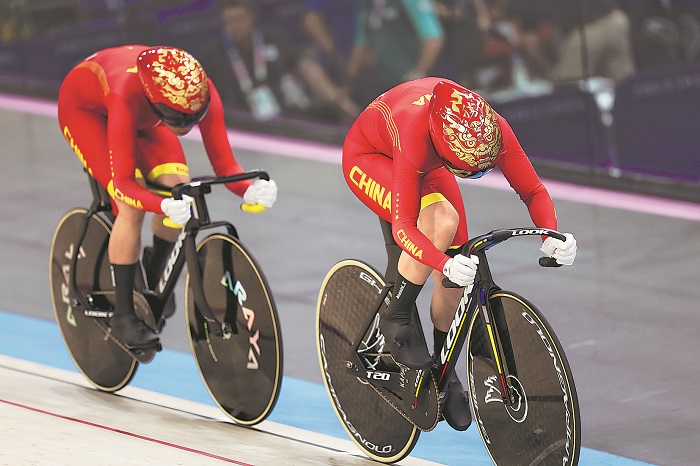 北京時(shí)間8月6日凌晨,在巴黎奧運(yùn)會(huì)場(chǎng)地自行車(chē)爭(zhēng)先賽中,中國(guó)隊(duì)獲得女子團(tuán)體第六名。圖為中國(guó)選手在女子團(tuán)體爭(zhēng)先賽首輪比賽中。