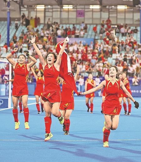 中國女子曲棍球隊在晉級決賽后慶祝。新華社記者 任鵬飛 攝