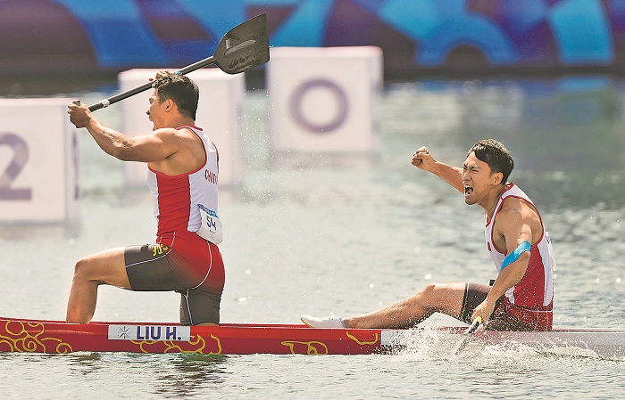 8月8日,在巴黎奧運會皮劃艇靜水男子雙人劃艇500米決賽中,中國選手劉浩(左)、季博文奪得金牌后慶祝。