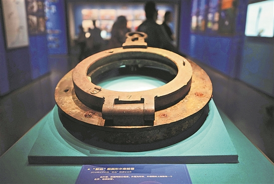 展出的致遠(yuǎn)艦圓形水密舷窗。新華社記者 徐速繪 攝