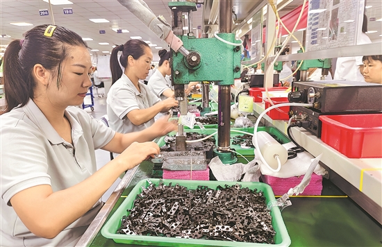 近日,位于重慶萬盛經(jīng)開區(qū)南桐鎮(zhèn)平山工業(yè)園區(qū)某生產(chǎn)車間,“媽媽崗”員工在生產(chǎn)線上進(jìn)行組裝作業(yè)。近年來,萬盛經(jīng)開區(qū)總工會推動民營企業(yè)做好建會入會工作,指導(dǎo)企業(yè)建立靈活用工機制,針對鄉(xiāng)村留守婦女專門開設(shè)“媽媽崗”,既方便她們照顧家庭又促進(jìn)就業(yè)。本報通訊員 曹永龍 攝