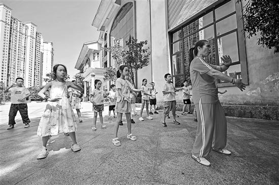暑假期間,為緩解雙職工家庭、新就業(yè)形態(tài)勞動(dòng)者等群體子女的托管難題,湖南省長(zhǎng)沙市望城區(qū)月亮島街道黃都港社區(qū)開(kāi)設(shè)了“愛(ài)心課堂”,提供朗誦、體育、書法等課程,豐富孩子們的假期生活。圖為小朋友跟著志愿者練習(xí)太極拳。新華社記者 陳澤國(guó) 攝