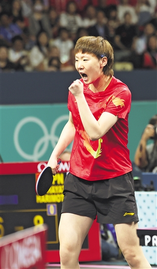 中國隊奪得乒乓球女團金牌。圖為中國隊成員王曼昱在比賽中慶祝。本報特派記者 楊登峰 攝