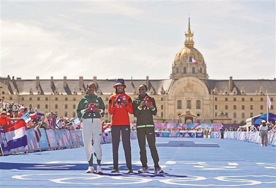 8月11日,荷蘭選手茜凡·哈桑(中)獲得巴黎奧運會女子馬拉松比賽冠軍。新華社記者 李京 攝
