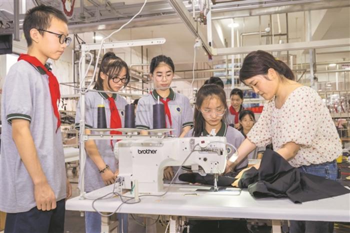 日前,安徽省合肥市第四十五中工業(yè)區(qū)分校中學生走進合肥廬陽經(jīng)濟開發(fā)區(qū)轄區(qū)清華勝嘉服飾有限公司服裝生產(chǎn)車間,體驗服裝文化和“智”造工藝。