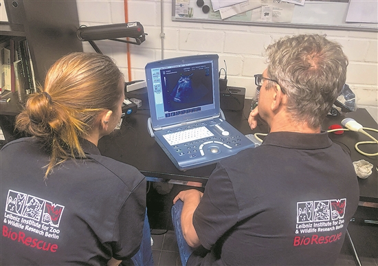 德國柏林動物園近日宣布,旅居柏林的中國大熊貓“夢夢”繼2019年成功產(chǎn)下一對雙胞胎后,再次確認(rèn)懷孕,超聲檢測到兩個胎兒的心跳。圖為在德國首都柏林,工作人員為大熊貓“夢夢”做超聲檢測。