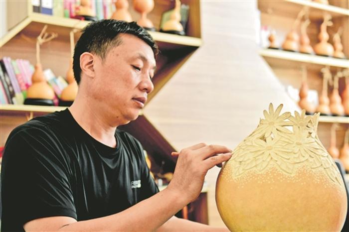 8月10日,在山東省濟(jì)寧市微山縣驩城鎮(zhèn)西田陳村福祿葫蘆合作社,村民在制作文創(chuàng)葫蘆。