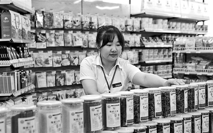 8月14日,工作人員在位于遼寧省朝陽市的喀左站的便利店中碼放鄉(xiāng)村特色農(nóng)副商品。