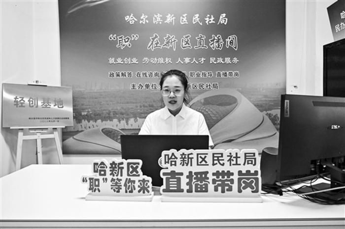 在哈爾濱新區(qū)民政和人力資源社會保障局人力資源和社會保障服務中心,工作人員進行“帶崗”直播,為求職人員找到合適的崗位(8月12日攝)。