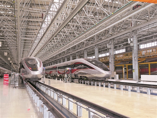 圖為在中車長(zhǎng)客國(guó)鐵事業(yè)部制造中心拍攝的復(fù)興號(hào)智能動(dòng)車組。