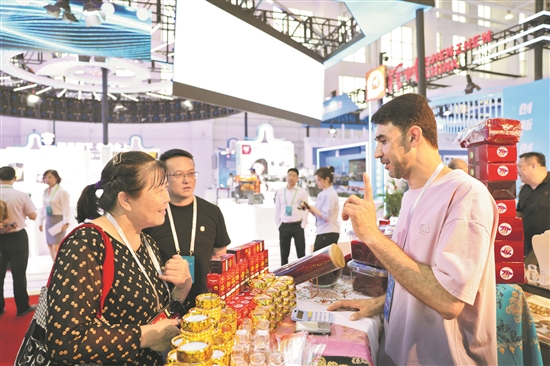 8月17日,國外參展商(右)向參觀者介紹商品。