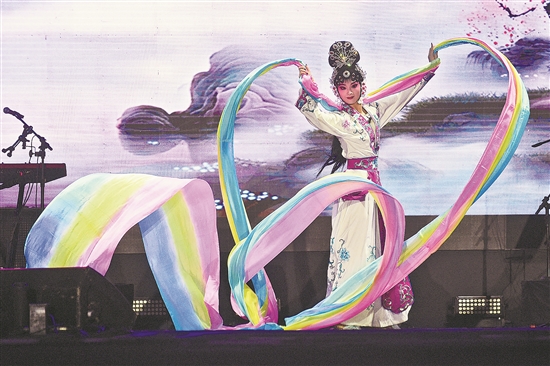 當?shù)貢r間8月17日,在巴西首都巴西利亞,來自浙江婺劇藝術研究院的演員在沙灘藝術節(jié)中國日活動上表演。新華社發(fā)(盧西奧·塔沃拉 攝)